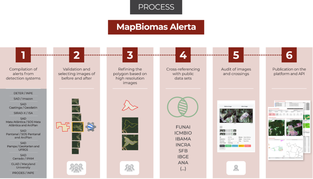 MapBiomas Alerta is a system that compiles alerts from different deforestation detection systems in Brazil, all based on remote sensing. The processing of this set of alerts involves the aggregation, validation, and refinement of spatial boundaries based on the use of high-resolution satellite imagery (Planet Scope with 3.7 m spatial resolution), generating reports, and publishing the final results on a single, open-access platform (https://plataforma.alerta.mapbiomas.org).